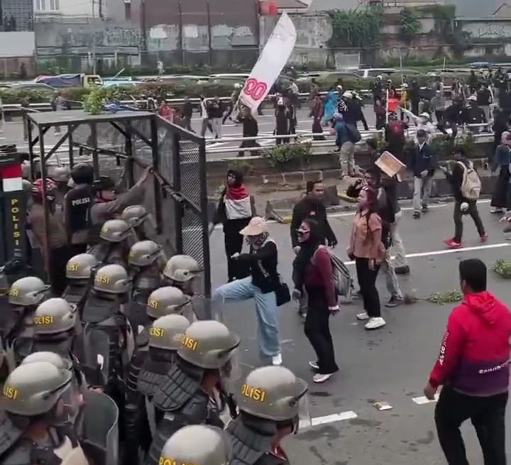Berdasarkan informasi, demonstrasi yang berlangsung sekitar pukul 09.30 WIB sempat berjalan damai dengan orasi dan nyanyian lagu perjuangan. Massa membawa spanduk bertuliskan Bubarkan DPR Beban Negara dan Indonesia Sold Out, serta bendera Merah Putih dan simbol tengkorak ala serial One Piece. Namun, situasi memanas sekitar pukul 12.45 WIB. Saat itu, massa berupaya menerobos beton dan pagar besi di sekitar Jalan Gatot Subroto.