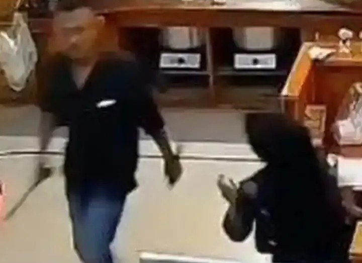 Seorang perempuan yang berada di area kasir terlihat berusaha menghentikan pelaku. Wanita tersebut tampak menahan dan melerai pelaku agar tidak melukai orang lain di lokasi kejadian.