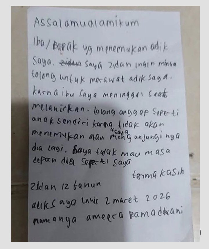 Dalam surat tersebut, Zidan menjelaskan bahwa ia meninggalkan adiknya karena ibu mereka meninggal dunia saat melahirkan.