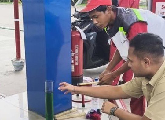 “Tadi sudah kita lihat bersama, bedanya antara pertalite yang ada kandungan airnya atau tidak. Kalau yang murni, warna pastanya tetap sama, tapi kalau ada kandungan airnya, pasta tersebut akan berubah menjadi warna pink,” imbuhnya.