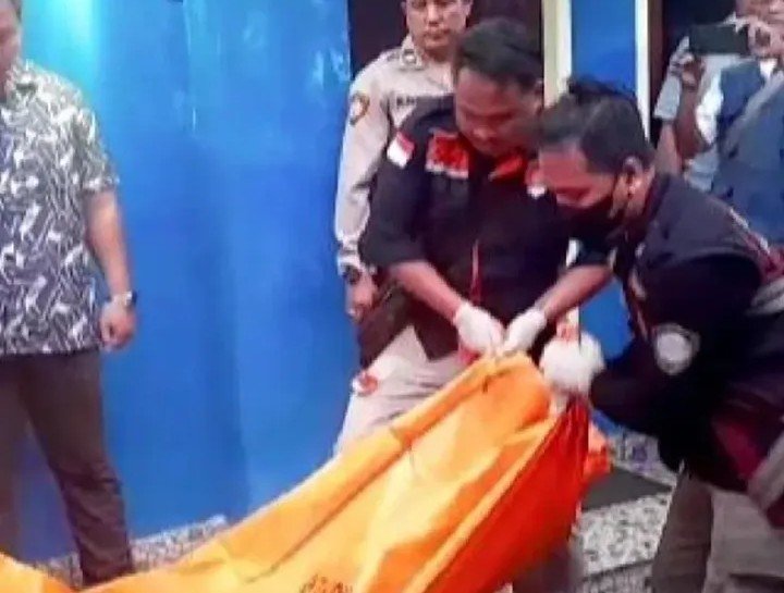 Korban ditemukan tergeletak di atas kasur dengan mengenakan kaus hitam dan celana pendek biru. Pada bagian kepala korban terdapat plastik dan lakban.