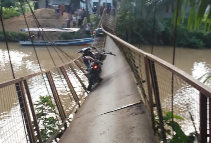 “Menurut keterangan saksi, sekitar pukul 06.30 WIB diketahui ada lima sepeda motor melintas di jembatan gantung. Saat warga melintas, tiba-tiba jembatan tersebut ambruk dan miring ke arah kanan akibat tali seling penopang atas putus, diduga karena tidak kuat menahan beban,” ujar Petugas Penanggulangan Bencana Kecamatan (P2BK) Tegalbuleud, Noris.