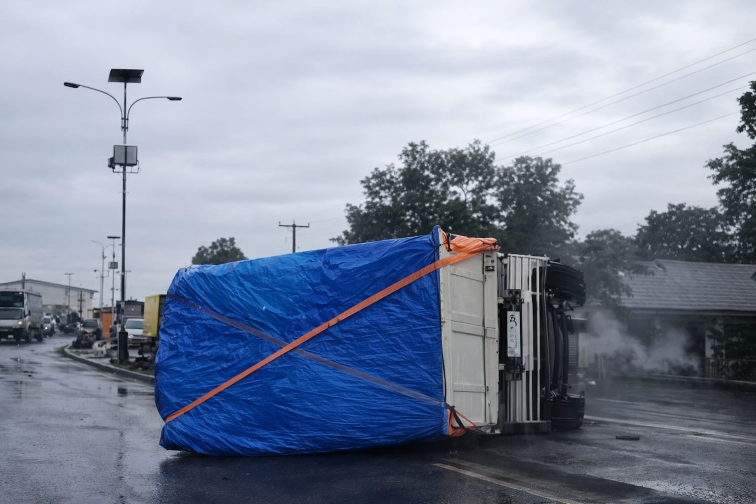 Di samping itu, menurut informasi di lapangan, truk melintas di ruas jalan dengan kondisi permukaan yang rusak cukup parah. Saat melaju, berdasarkan dugaan, roda kendaraan menghantam lubang jalan. Sehingga, pengemudi kehilangan kendali dan truk pun terguling di badan jalan.