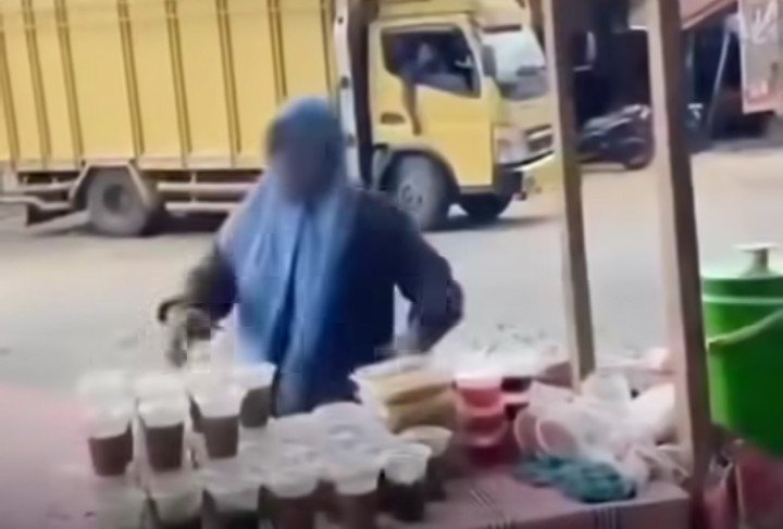 Setelah diminta memindahkan lapak ke lokasi lain yang tidak dipasangi garis polisi, pedagang tersebut justru meluapkan kekesalannya dengan membuang dagangan yang telah disiapkan untuk berbuka.