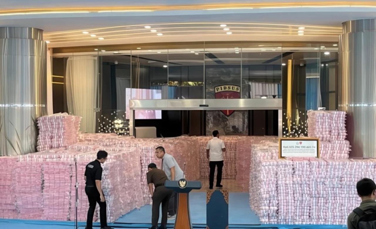 Jakarta, mediasatu.co.id – Tumpukan uang pecahan Rp 100 ribu setinggi hampir dua meter terlihat di Gedung Tindak Pidana Khusus Kejaksaan Agung, Jakarta, Rabu (24/12/2025). Uang tersebut merupakan simbol keberhasilan pemerintah dalam menyelamatkan dan mengembalikan kerugian negara senilai Rp 6,6 triliun dari kasus korupsi dan pelanggaran kawasan hutan.