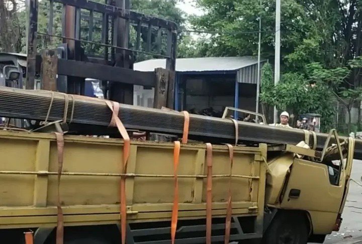 “Mau ngindarin mobil di depan, jadi dia ngerem mendadak. Enggak kuat penyangganya, jadi turun itu (muatan besi), enggak kuat itu penyangganya. Meninggal dua orang,” tutur Toni.